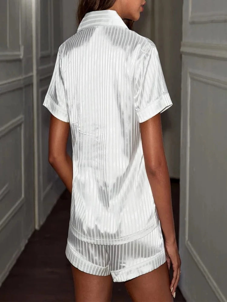 Entdecken Sie unsere verführerische Nachtwäsche aus gestreiftem Satin für alle, die auf der Suche nach ultimativem Komfort und Eleganz sind. Diese Nachtwäsche aus weichem Satin ist mit einem raffinierten Streifendruck versehen, der Ihrer Nachtruhe einen Hauch von Luxus verleiht. Der Knopfverschluss ist ein praktisches und schickes Element, mit dem Sie ganz einfach in die Nachtwäsche hinein- und wieder herausschlüpfen können. Ganz gleich, ob Sie einen entspannten Abend zu Hause verbringen oder sich eine erholsame Nachtruhe gönnen möchten, diese gestreifte Satin-Nachtwäsche bietet die perfekte Balance aus Komfort und Stil. Gönnen Sie sich eine erholsame Nachtruhe in dieser schönen Kreation.