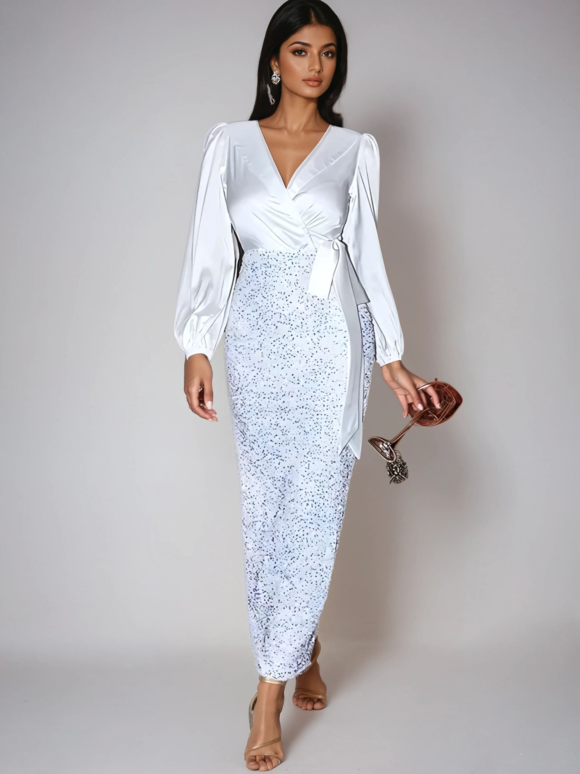 Dieses schicke Kleid mit einem Satin-Oberteil und einem schimmernden Glitzer-Unterteil ist die Definition von zeitloser Eleganz und Glamour. Dieses Kleid ist so konzipiert, dass Sie bei besonderen Anlässen und festlichen Veranstaltungen glänzen können.