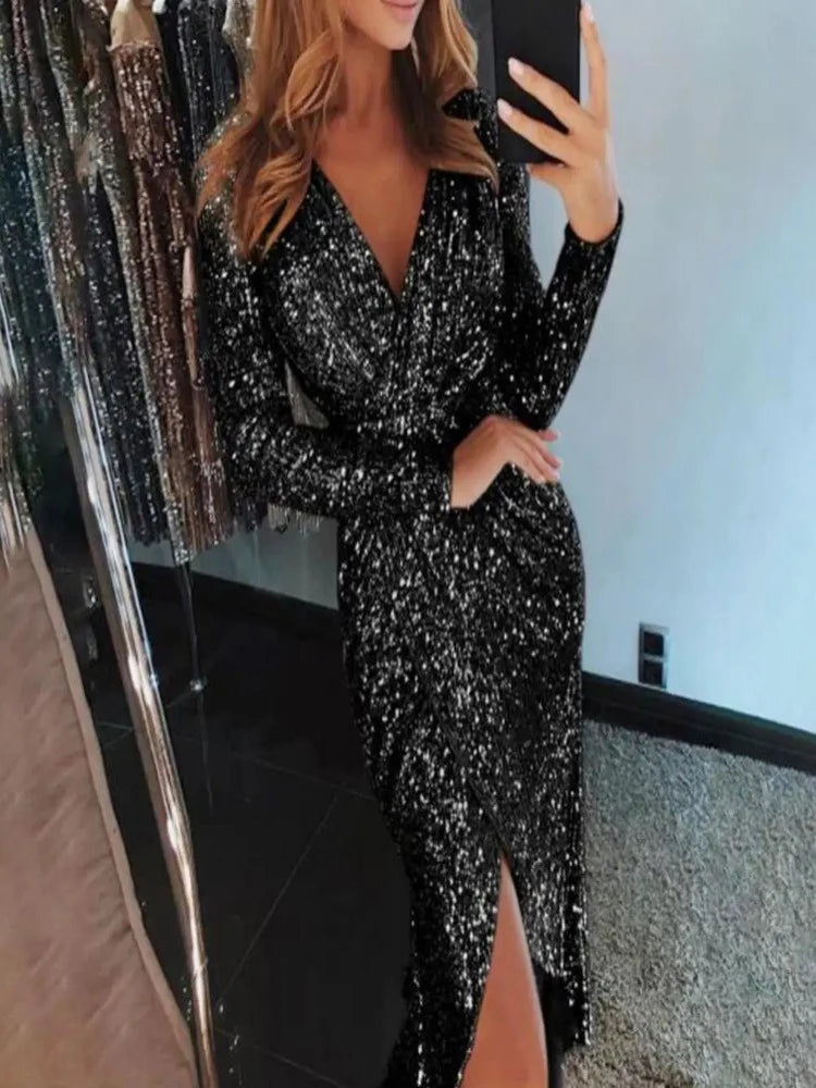Deze verleidelijke schede jurk met een elegante V-hals en sprankelende glitters is de perfecte keuze voor die speciale gelegenheid waarop je wilt stralen. De jurk omhult je lichaam op een flatterende manier en benadrukt je vrouwelijke rondingen, terwijl de diepe V-hals je decolleté subtiel accentueert. De glinsterende glitters voegen een vleugje glamour toe aan je look, waardoor je ongetwijfeld in het middelpunt van de aandacht zult staan. Of je nu naar een chique feest, gala of een avondje uit gaat, deze jurk zorgt ervoor dat je er stralend uitziet en je zelfverzekerd voelt. Kies voor deze stijlvolle jurk en maak een onvergetelijke indruk op elk evenement.