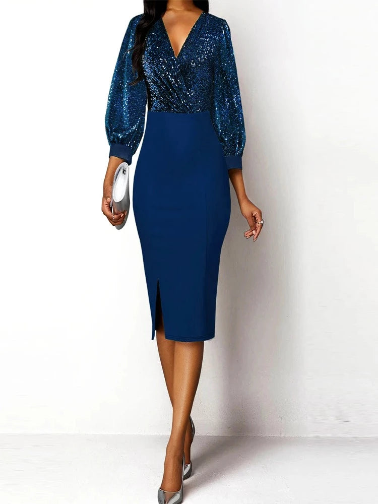 Dieses bezaubernde Midikleid verbindet mühelos Glanz und Eleganz. Der V-Ausschnitt am Oberteil sorgt für einen Hauch von Verführung, während das schimmernde Oberteil mit Glitzer Ihrem Look ein Funkeln verleiht. Unterhalb der Taille verwandelt das Satinteil das Kleid in eine Oase der Weichheit und des Komforts. Dieses Kleid ist perfekt für Anlässe, bei denen Sie raffiniert und stilvoll aussehen möchten. Ob auf einer Cocktailparty, einer Hochzeit oder einem besonderen Abend, mit diesem Kleid werden Sie zweifellos bewundernde Blicke und Komplimente ernten. Entscheiden Sie sich für dieses traumhafte Kleid und glänzen Sie bei jeder Gelegenheit.