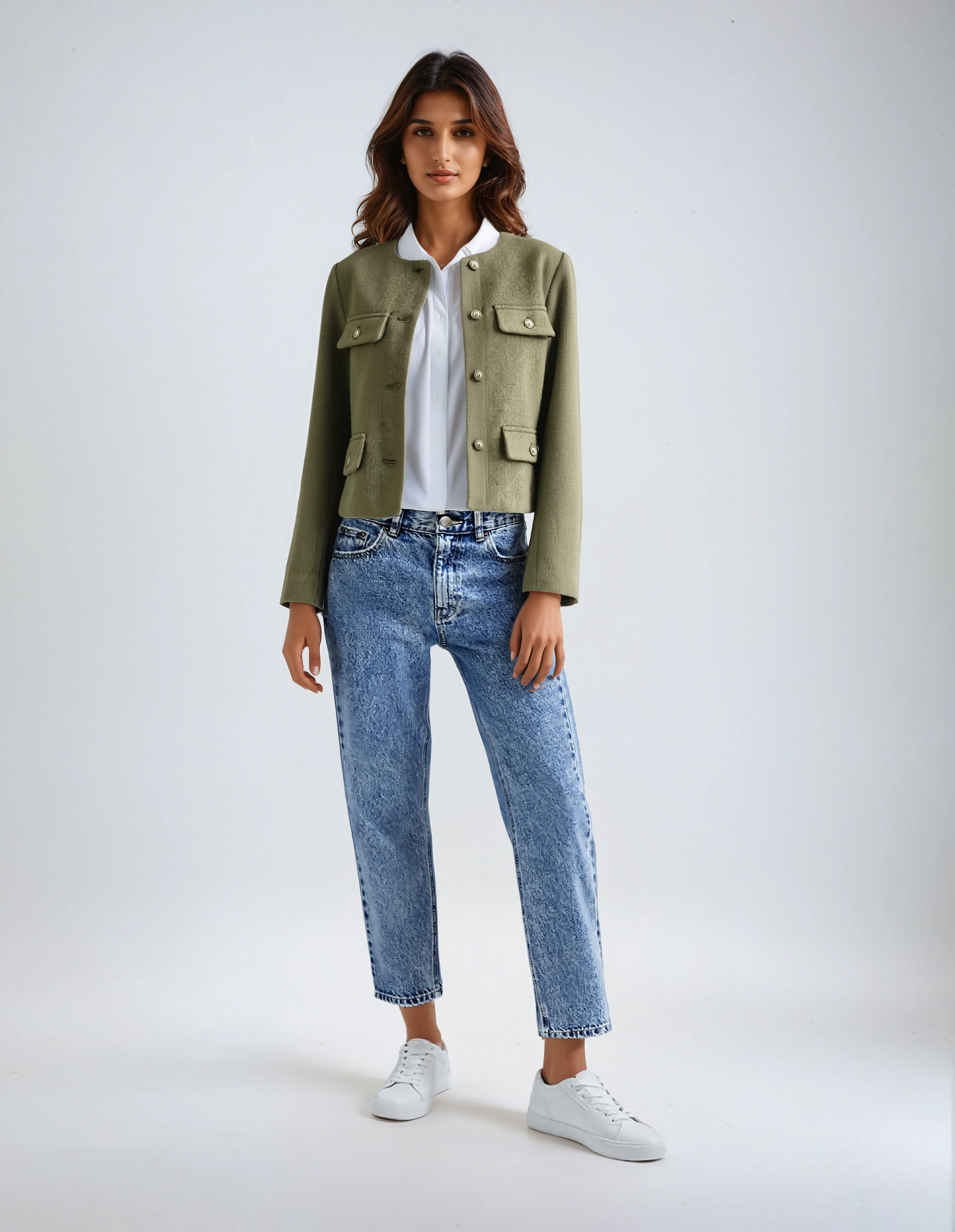 Form und Passform: Die weit geschnittene Passform betont die weibliche Silhouette, während die verkürzte Länge der Jacke einen modernen, modischen Look bietet.